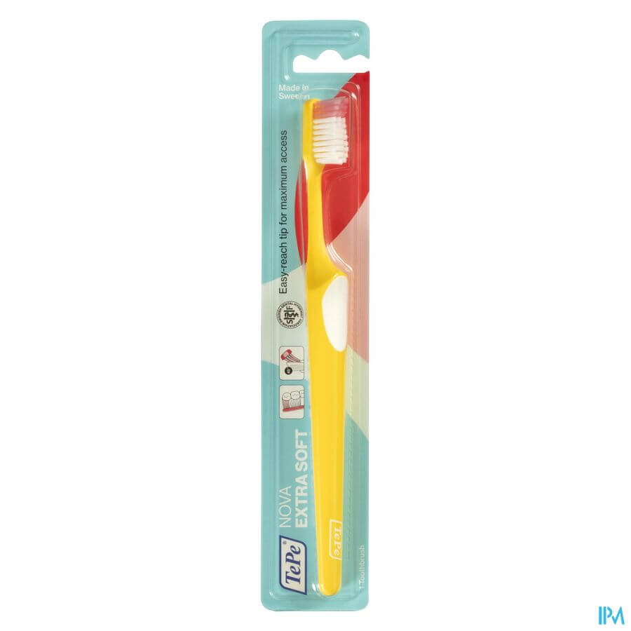 La brosse à dents TePe Nova est conçue avec un embout pour accéder aux zones difficiles à atteindre, notamment derrière les dents. La brosse à dents Nova possède un manche ergonomique antidérapant avec un coussin pour le pouce. Le col de la brosse à dents peut être plié sans être chauffé. Disponible avec des poils extra doux, doux ou moyens. Les tailles se distinguent par leurs couleurs.