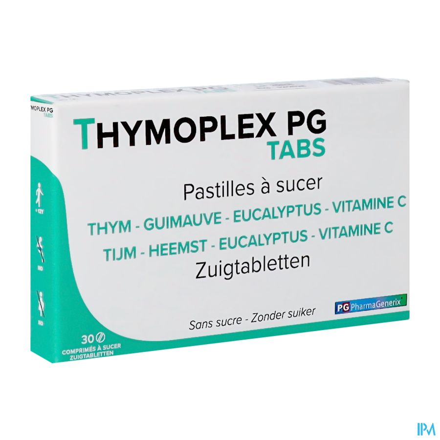 Thymoplex Tabs PG contient des extraits de thym et de guimauve, de la vitamine C et de l'arôme eucalyptus.