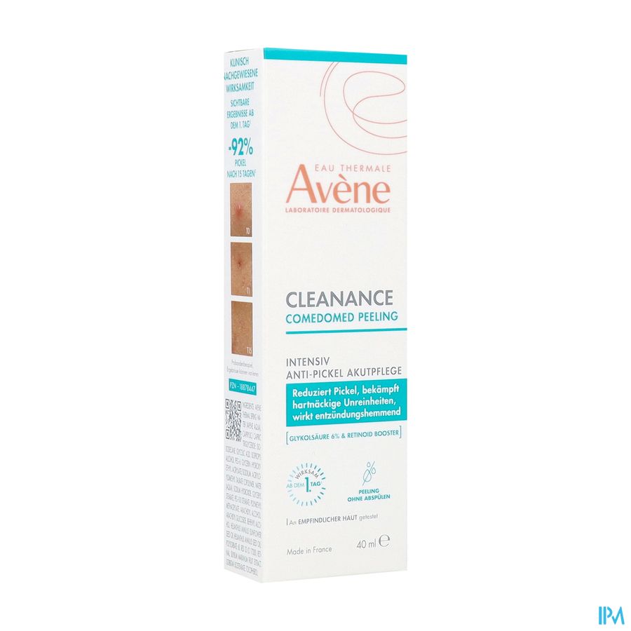 La crème Comedomed Peeling est le nouvel allié face aux poussées de boutons. Elle cible toutes les imperfections visibles des peaux à tendance acnéique avec une formule unique et ultra-efficace grâce à l'association d'actifs dermatologiques : l'Acide Glycolique exfolie et stimule le renouvellement cellulaire pour un effet peau neuve grâce à son action kératolytique. Le Retinoid Booster, favorise la résorption des boutons et la réduction des marques résiduelles grâce à une association brevetée** de Retinal, forme la plus efficace de la Vitamine A et de Comedoclastin™. Elle s'applique le soir sur le visage propre et sec dès l'apparition des imperfections et jusqu'à leur disparition, avec une durée maximale de 15 jours d'utilisation. Sa texture crème permet une absorption rapide du produit et au fini non gras sur la peau.